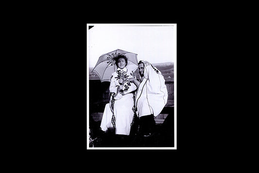 Pocztówka Stanisława Ignacego Witkiewicza - Witkiewicz z kuzynką (Dziudzią) w jej autorskich strojach; Zakopane "willa na Antałówce"