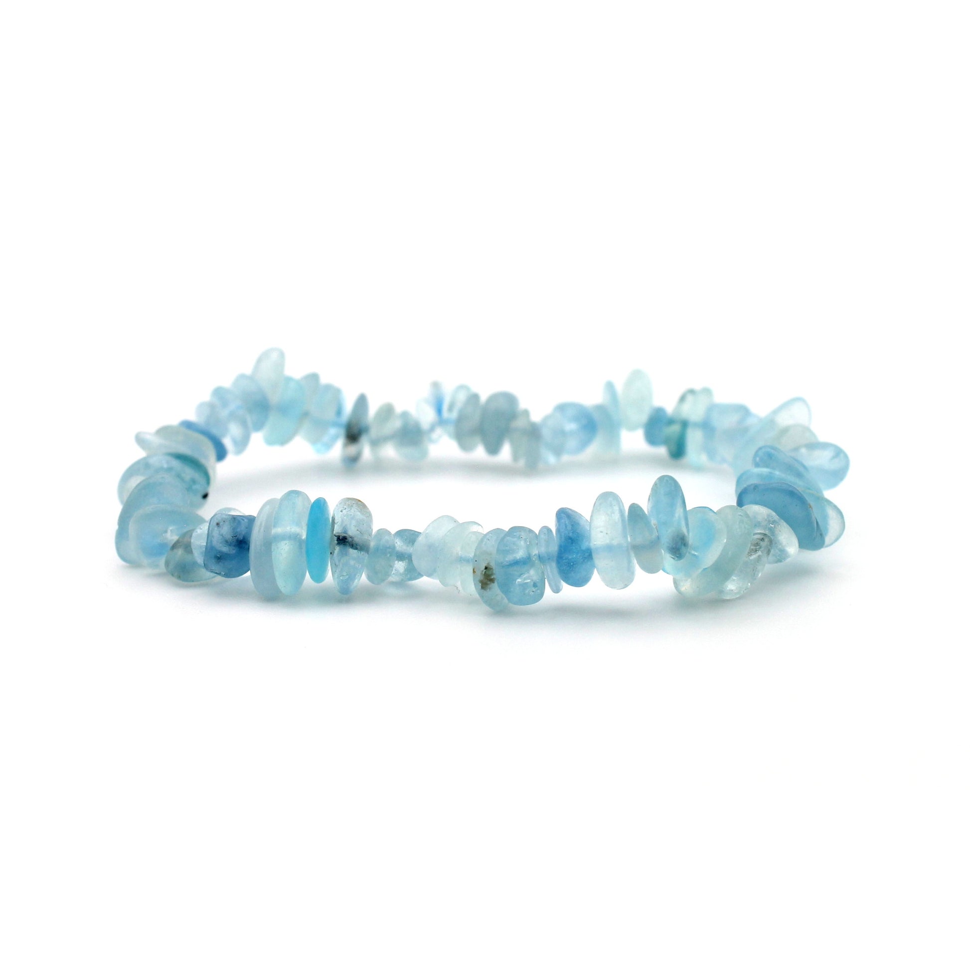 Bransoletka wykonana jest z nieregularnych otoczaków akwamarynu nawleczonych na elastyczną gumkę.
