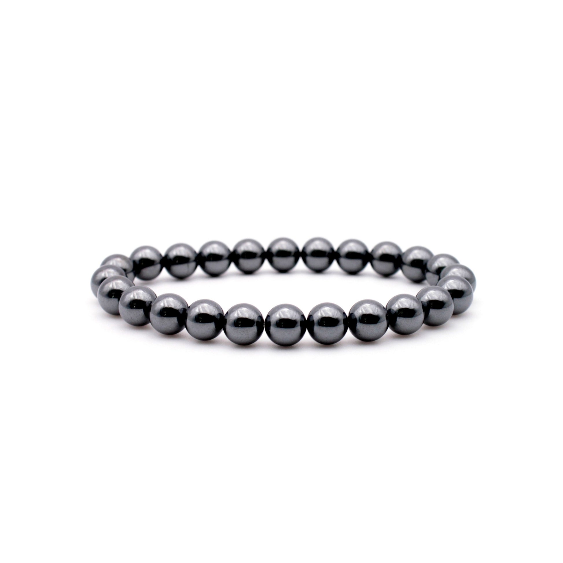 Bransoletka została wykonana z 8-milimetrowych kulek hematytu, nawleczonych na wytrzymałą, elastyczną gumkę.