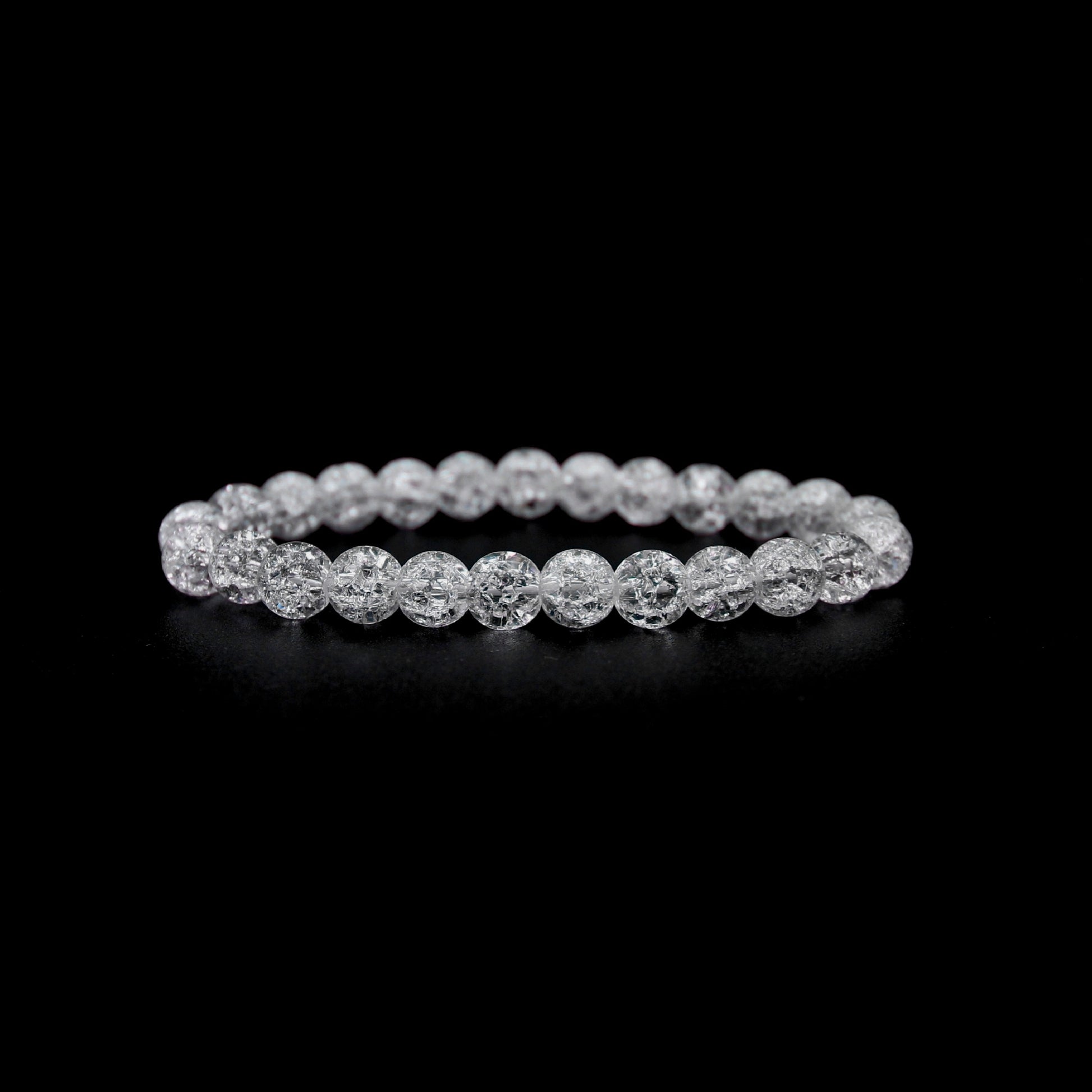 Bransoletka została wykonana z naturalnych kamieni kryształu górskiego lodowego w formie gładkich, 8-milimetrowych kulek, nawleczonych na elastyczną i wytrzymałą gumkę. Bransoletka wygodnie dopasowuje się do nadgarstka i świetnie sprawdza się w codziennym noszeniu.