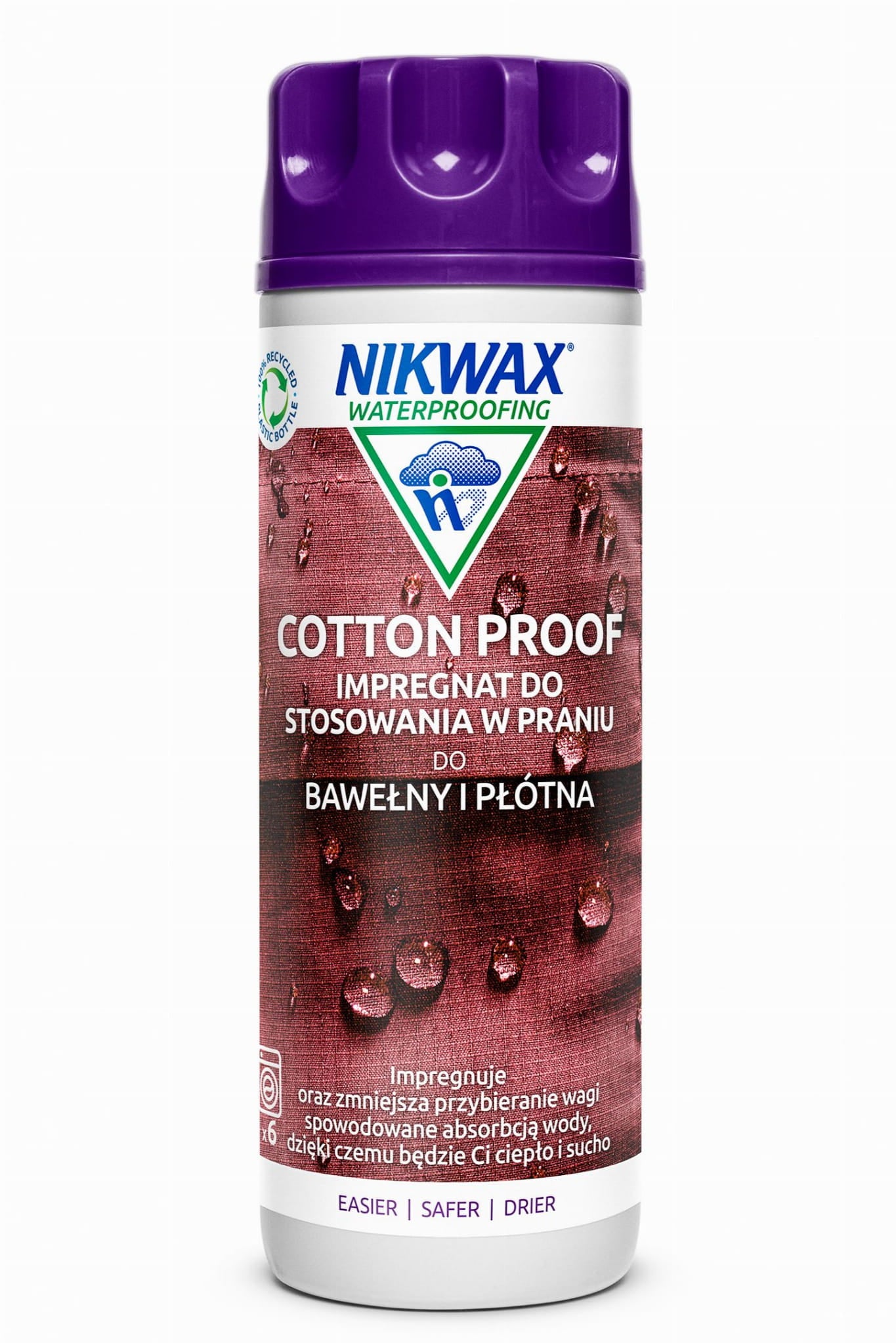 Nikwax Cotton Proof został specjalnie zaprojektowany i zoptymalizowany dla oddychającej bawełny, mieszanek bawełna-poliester i brezentu; na pojedynczych włóknach pozostawia elastyczną warstwę hydrofobową, co pozwala oparom wilgoci przedostać się na zewnątrz, zachowując właściwości oddychające, przedłużając żywotność odzieży oraz sprzętu i optymalizując jego wydajność przy deszczowej pogodzie.