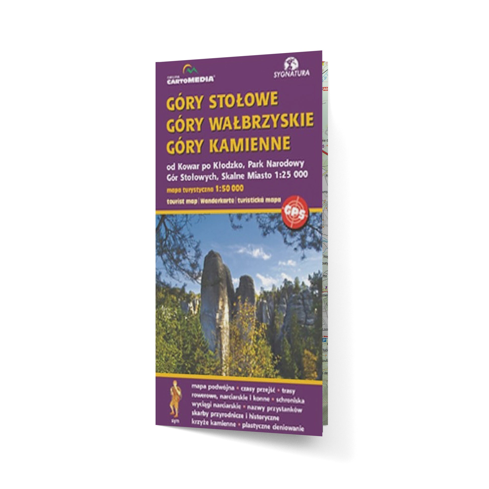 Mapa "potrójna" tzn., że na jednym arkuszu przedstawiliśmy zasięg obszaru, który najczęściej występuje na 3 oddzielnych mapach. Najlepiej oddaje to reklamowy slogan "3 w 1". Od Kowar po Kłodzko. Park Narodowy Gór Stołowych, Skalne Miasto. Mapa zawiera m.in. czasy przejść, szlaki piesze, rowerowe, konne i narciarskie. Nazwy przystanków, skarby przyrodnicze i historyczne, schroniska. Atutem jest plastyczne cieniowanie rzeźby terenu. Mapa z serii Rodzina sudecka
