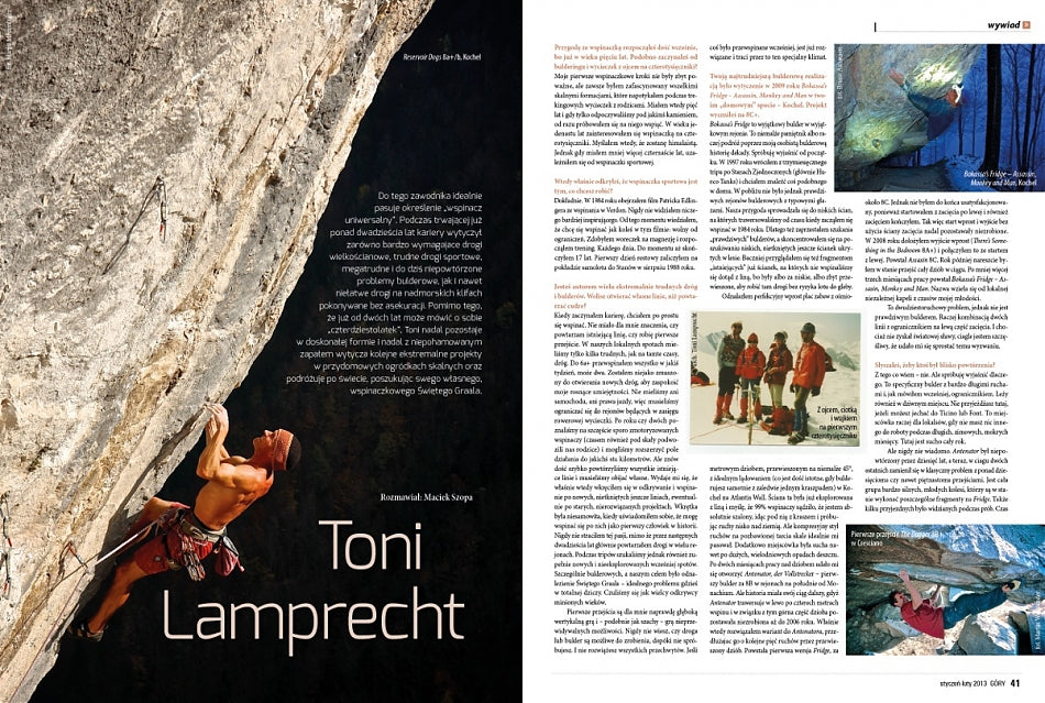 Z pewnością jednym z wyróżniających się materiałów jest wywiad z Tonim Lamprechtem, prawdziwym "all-rounderem", czyli wspinaczem uniwersalnym. W trakcie ponaddwudziestoletniej kariery rozwiązał on zarówno megatrudne i do dzis niepowtórzone problemy bulderowe, jak i wytyczył bardzo wymagajace drogi wielkościanowe. Ponadto otworzył trudne drogi sportowe i DWS. Na dodatek ma ciekawą pracę i ... gra w zespole punkowym. Nic dodać, nic ująć...