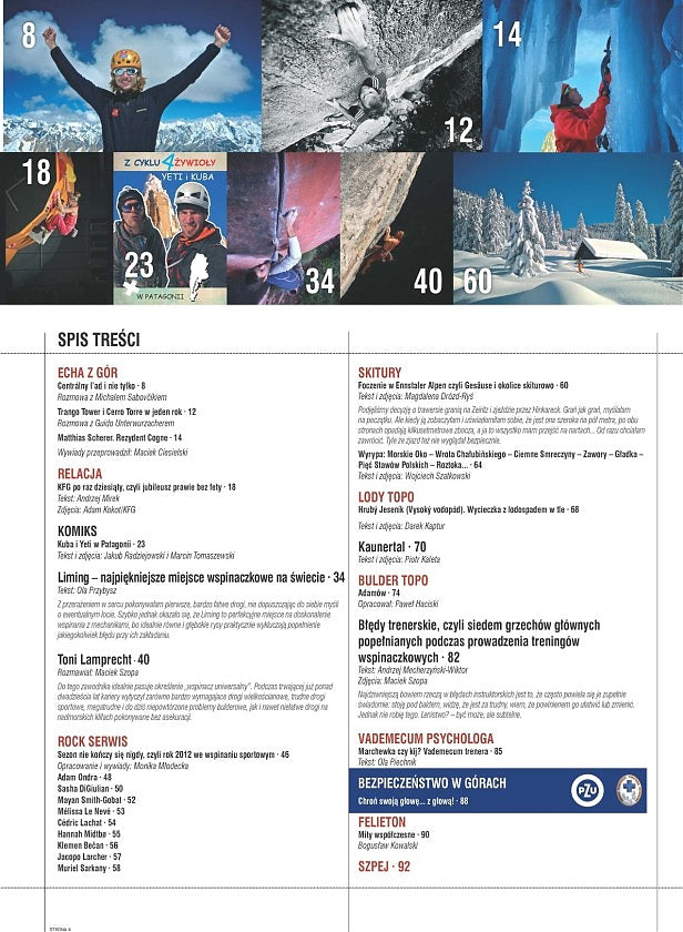 Numer otwierają trzy wywiady w Echach z gór, których wspólnym mianownikiem jest wspinaczka w lodzie i mikście. Michal Sabovčík opowiada o nowej drodze w Tatrach, a także zmaganiach na Trango, Guido Unterwurzacher o wejściu na Nameless Tower i Cerro Torre, a Matthias Scherer o lodach w Cogne i Kanadzie.