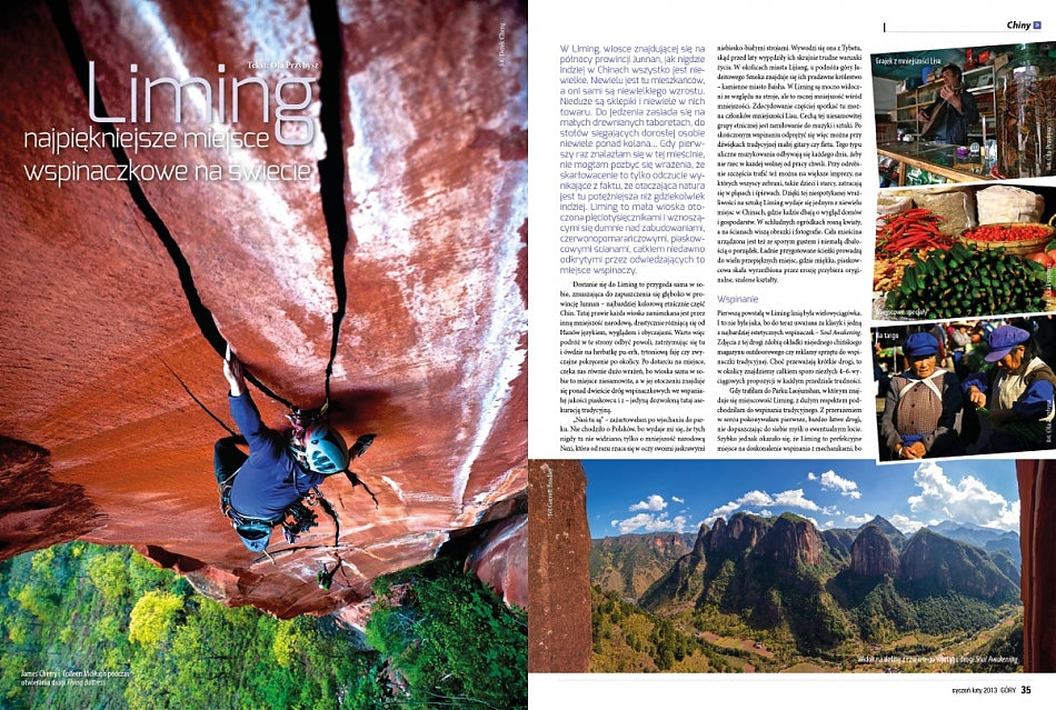 Miłośnicy wspinania z przyjemnością przeczytają też zapewne kolejny tekst Oli Przybysz o wspinaniu w Chinach, okraszony świetnymi zdjęciami. Liming - bo o nim mowa - to świetne miejsce do doskonalenia techniki wspinania w rysach.