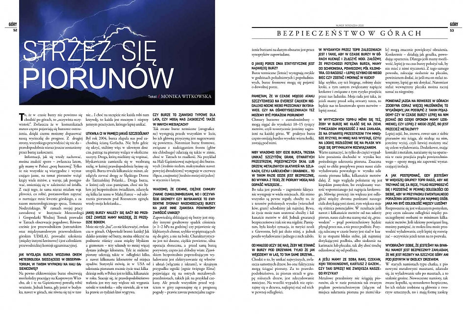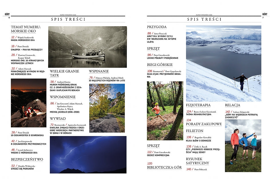 Jeśli nie wystraszymy się tłumu nad Morskim Okiem, ocenianego w skali roku na ponad 700 000 osób, będziemy mogli zaliczyć ambitną wycieczkę na znaną wszystkim, ale rzadko odwiedzaną turniczkę Chłopek, która obok Żabiej Lalki i Mnicha przykuwa uwagę swoim strzelistym kształtem i budzi zdobywcze pragnienia. Podobnej inspiracji może też dostarczyć zestawienie dziesięciu najpopularniejszych, być może nawet najciekawszych dróg wspinaczkowych w tym rejonie. Majestat wielkich ścian i strzelistych turni ma jednak swoje prawa, więc ku przestrodze publikujemy opisy wypadków, które miały miejsce w rejonie Moka. Latem istnieje duże prawdopodobieństwo, że zostaniemy zaskoczeni w górach przez burzę - jak rzeczywiście wygląda to groźne zjawisko i jak należy się zachować, dowiecie się z wywiadu przeprowadzonego z meteorologicznym specem. W numerze wspominamy też Michała Jagiełłę. Zmarły w tym roku autor Wołania w górach był przez lata związany z Tatrami - zawodowo, jako naczelnik TOPR, ale przede wszystkim jako ich znawca i miłośnik.