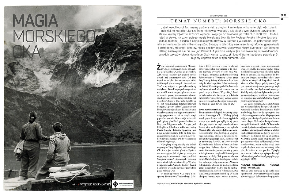 Tak, to TRUE - niezliczone tabuny ludzi nad Morskim Okiem stanowią skuteczną barierę, przez którą większości z nas nie chce się przedzierać, aby zajrzeć za kurtynę tej wspaniałej górskiej sceny. Warto jednak podjąć wysiłek, o czym przekonacie się z najnowszej, tatrzańskiej edycji magazynu GóRY, w której znajdziecie artykuły pozwalające na nowo odkryć ten "zadeptany" fragment Tatr Wysokich: jego nieznane szerzej historyczne uwarunkowania, które sprawiły, że obecnie jest to jedno z najbardziej popularnych miejsc w Tatrach.
