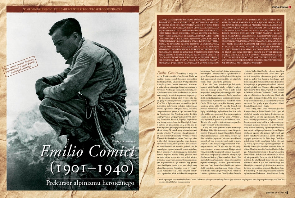 Pretekst do publikacji kolejnego bloku materiałów był zupełnie inny. W 70 rocznicę śmierci Emilio Comiciego postanowiliśmy przypomnieć sylwetkę wielkiego włoskiego wspinacza. Nie ma chyba żadnej przesady w stwierdzeniu, że autor słynnej linii na Cima Grande di Lavaredo jest jednym z tych wspinaczy, którego drogi są powszechnie znane, a życiorys - wręcz przeciwnie. Zaległości te możemy nadrobić dzięki artykułowi Mariana Krawczyka, który nie tylko szczegółowo opisał życie i działalność górską legendarnego Włocha, ale także zadał sobie trud przetłumaczenia i zacytowania obszernych fragmentów jego niepublikowanej w języku polskim autobiografii. Proza ta jest wprawdzie nieco staroświecka, za to świetnie oddaje ducha tamtej epoki i chyba także charakter jej autora. Materiał o Comicim uzupełniają wspomnienia z dwóch ważnych dokonań naszych wspinaczy na jego drogach. Zbigniew Wach wspomina pierwsze zimowe przejście Comici - Benedetti na Civetcie, a Andrzej Lipka - pokonanie bez asekuracji północnej ściany Cima Grande.