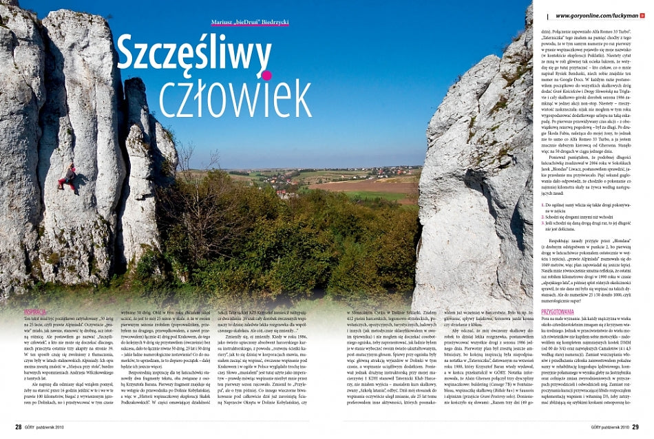 Doświadczenia z wieloletniej walki o pokonanie Action Directe zainspirowały Adama do napisania publikowanego przez nas opowiadanka "Minuta dwadzieścia". Mimo że lektura tego tekstu trwa zaledwie kilka razy dłużej niż czas podany w tytule, to wrażenia, które wywołuje, mają długotrwałe skutki. Nie inaczej jest z napisanym przez Konrada tekstem, w którym opisuje on przygodę na End of Silence oraz naświetla swoją drogę od "ściankowca" do "wielkościanowca". Autor po raz kolejny udowadnia, że posiada dobre pióro, którym błysnął już w kilku pamiętnych publikacjach internetowych. Odmówienie talentu literackiego byłoby także ostatnią rzeczą, którą można by zarzucić Mariuszowi Biedrzyckiemu. Dobitny na to dowód znajdziemy w najdłuższym tekście numeru, który - bez przesady - anonsujemy na okładce jako "epicka opowieść bieDrunia". Jego "Szczęśliwy człowiek" wpisuje się w tradycję najbarwniejszych GóR-skich opowiadań.