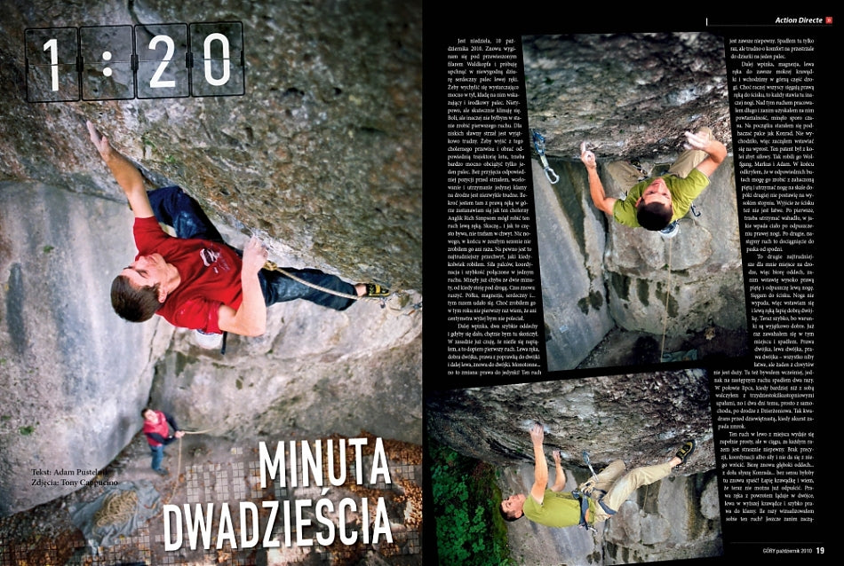 W ostatnich miesiącach nasi czołowi wspinacze fundują osobom mojego pokolenia - mam tu na myśli tych, którzy jak ja "wychowali się" wspinaczkowo w latach dziewięćdziesiątych - swoistą podróż sentymentalną. Najpierw doczekaliśmy się pierwszego polskiego przejścia End of Silence, które dostarczyło nam tematu okładkowego miesiąc temu. Niedługo potem padła kolejna droga-legenda: Action Directe. O ile Koniec Ciszy była jedną z kilku dróg o podobnej klasie i znaczeniu dla historii ekstremalnej wspinaczki wielowyciągowej, o tyle frankoński pasaż autorstwa Wolfganga Güllicha urósł do miana symbolu wspinaczki sportowej. Z tego też powodu można zaryzykować stwierdzenie, że symbolicznie dopiero teraz, dzięki przejściu Adama Pustelnika, polska wspinaczka na dobre wkroczyła w erę 9a.