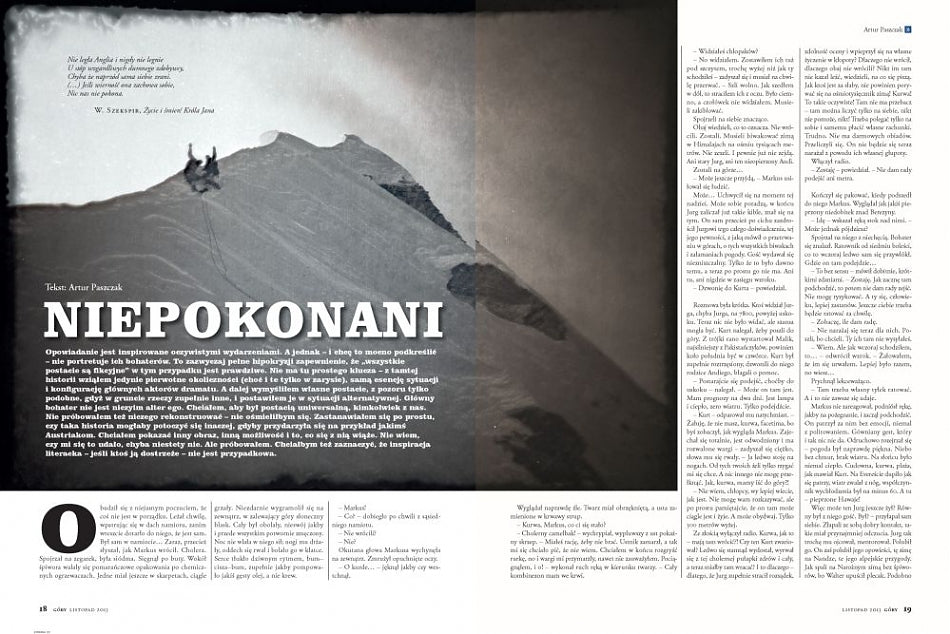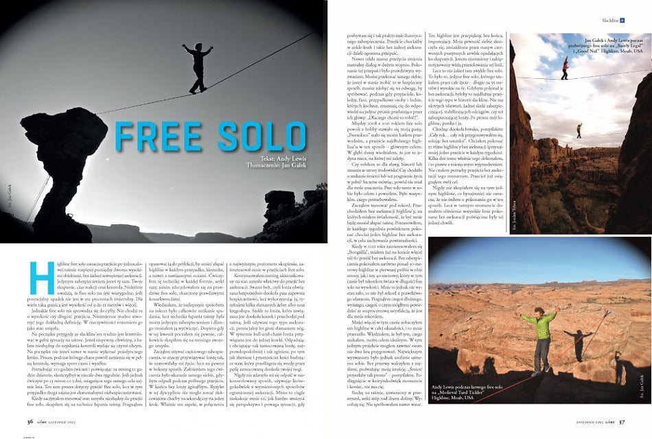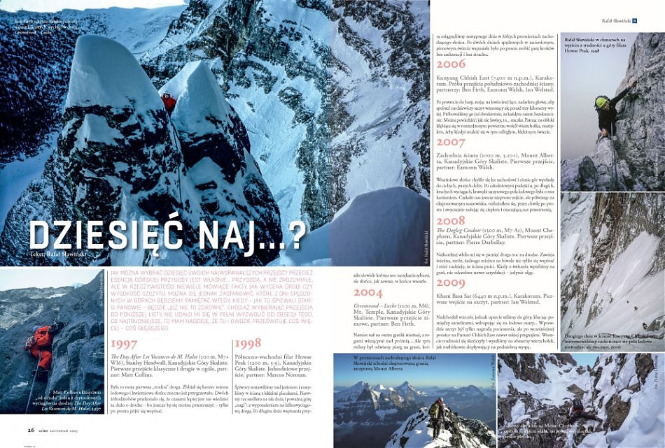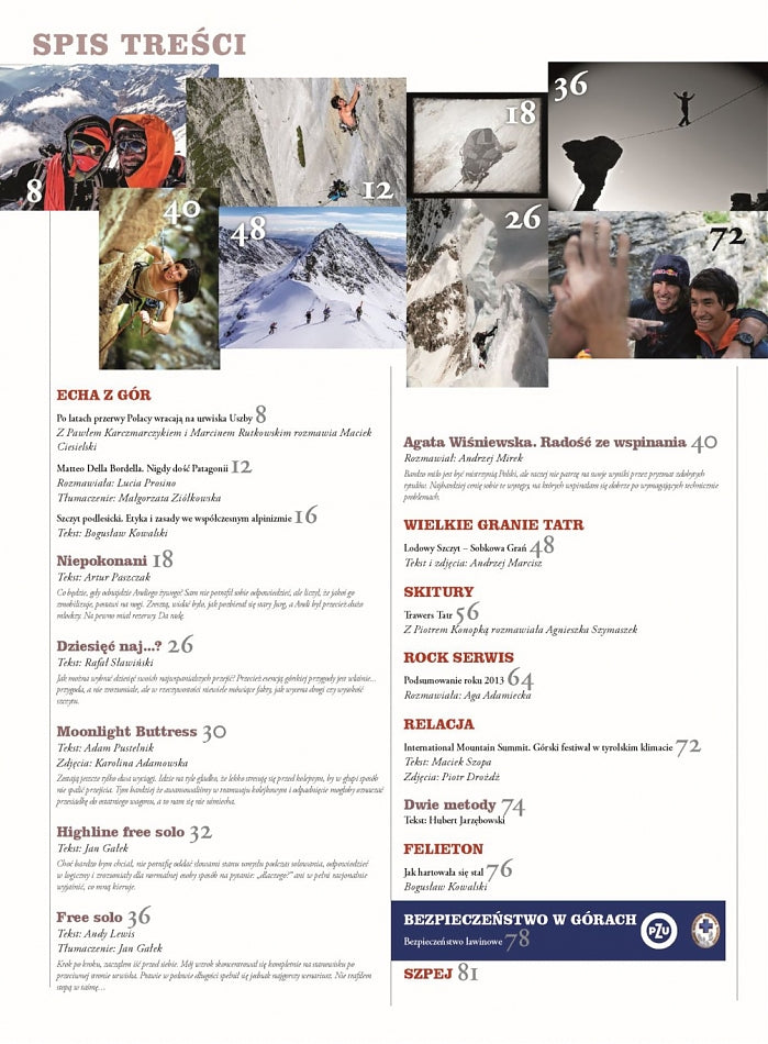 W numerze "Niepokonani" czyli między egoizmem a heroizmem, highline free solo, dziesięć najwspanialszych przejść Rafała Sławińskiego, wywiady z Agatą Wiśniewską i Matteo Della Bordella, Uszba, Moonlight Buttress, trawers Tatr - na nartach, Sobkowa Grań - wspinaczkowo, podsumowanie polskiego sezonu 2013 w skałach oraz wiele innych, ciekawych materiałów.