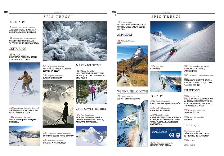 W specjalnym zimowym numerze GÓR (nr 240) m.in.: skituring (Haute Route w stylu retro, Grossvenediger, Mustagh Ata, Dolina Pięciu Stawów, Śnieżnik), wywiady (Andrzej Bargiel, Olek Ostrowski), najlepsze wycieczki na nartach biegowych - propozycje Kadry Narodowej, narty na Słowacji, wspinanie lodowe w Austrii i Hiszpanii, alpinizm (Wielki Filar Narożny Mont Blanc i Matterhorn), porady sprzętowe, felietony.