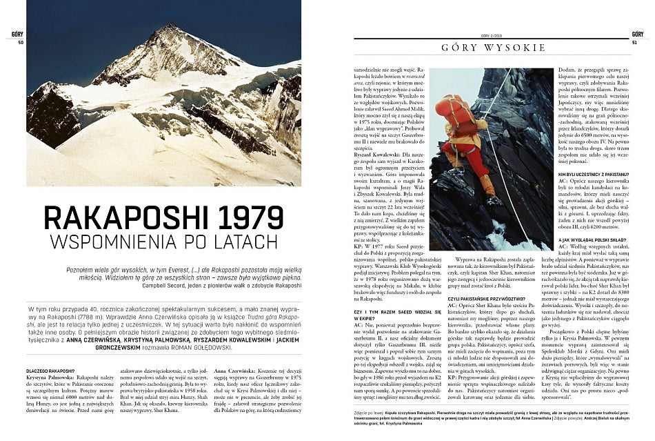 Przygotowując numer, którego hasłem przewodnim miały być Polskie Himalaje, postanowiliśmy przypomnieć sylwetki "wielkich niedocenionych" w obszernych artykułach. Oczywiście lista świetnych, a zapomnianych alpinistów jest znacznie dłuższa, więc mamy zamiar kontynuować tę misję w przyszłości, ale zaczynamy właśnie od wspomnianej Wielkiej Piątki. Bardzo ciekawym dodatkiem do bloku materiałów o historii polskiego himalaizmu jest rocznicowy artykuł o wyprawie na Rakaposhi 1979. Oczywiście nasze czasopismo nigdy nie jest monotematyczne i komponując poszczególne składniki GóR, staramy się kierować maksymą "dla każdego coś miłego". Nie inaczej jest tym razem. Miłośnicy wygrzanej słońcem skały będą mogli więc przeczytać o bazaltowych ogródkach Teneryfy. Dla tych, którzy uznają, że powinni przed tym wyjazdem wzmocnić palce, przygotowaliśmy przegląd chwytotablic oraz artykuł o treningu na tych popularnych przyrządach.