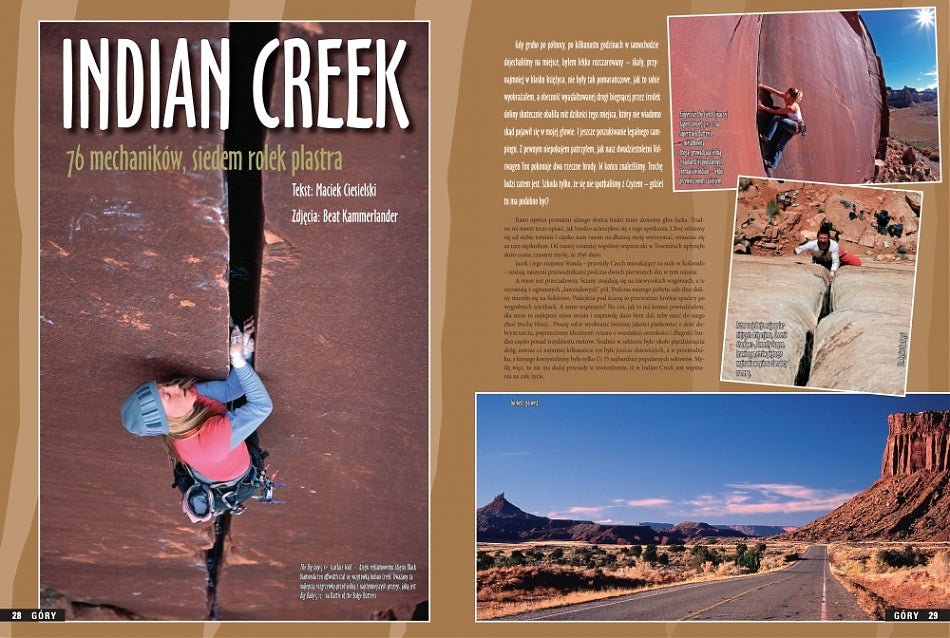 "Jeszcze szybko kilka metrów, kilka przechwytów, aby potem być już tylko dla swojej kobiety i dziecka, gdy rozpocznie się poród. To była motywacja Hariego, gdy tego dnia postanowił wyskoczyć w góry. W rejon, w którym trudno było spodziewać się jakiegokolwiek ryzyka i niebezpieczeństwa..."Indian Creek: 76 mechaników, 7 rolek plastra - tekst: Maciek Ciesielski, zdjęcia: Beat Kammerlander