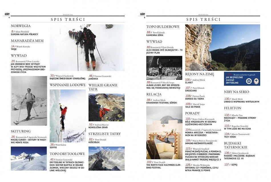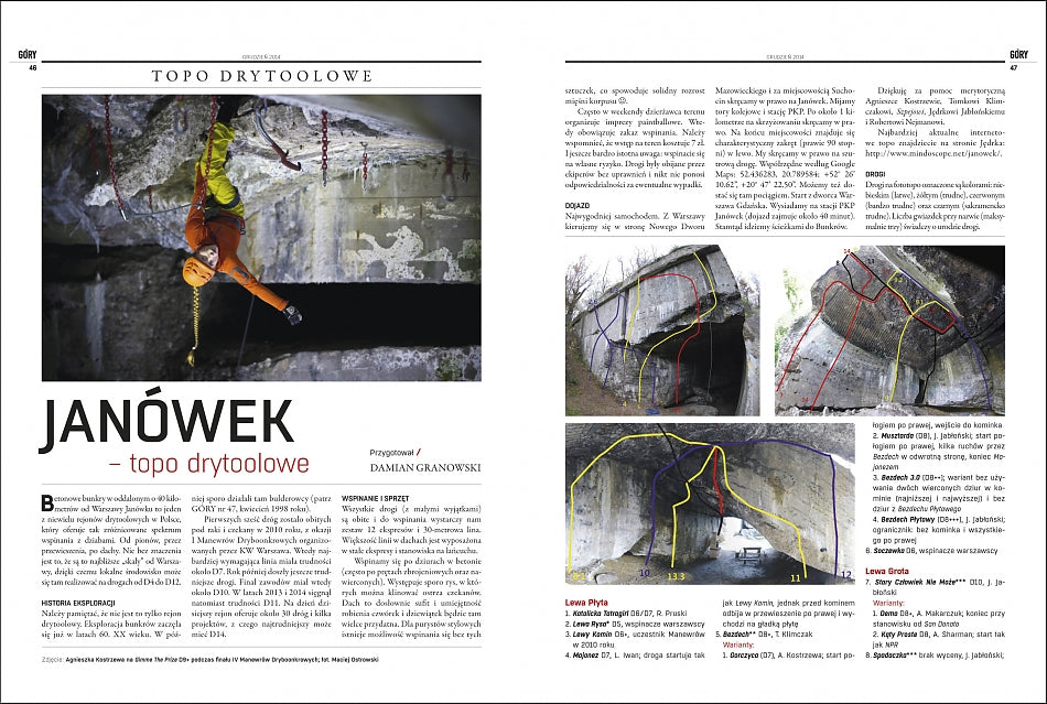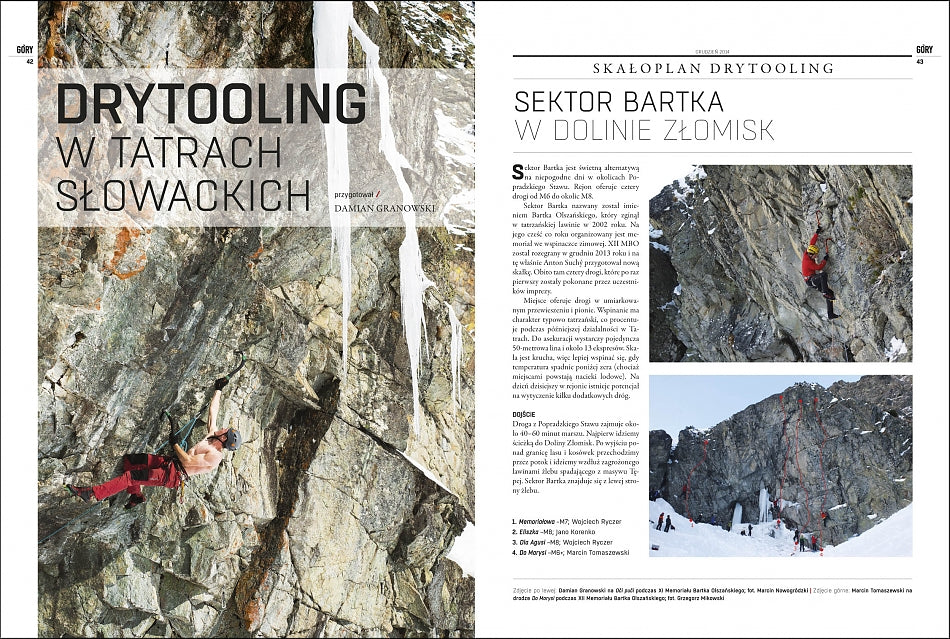 Przygotowaliśmy też dla was szereg toposów. Pokaźnych rozmiarów skałoplan bulderowy będzie z pewnością łakomym kąskiem dla wszystkich wielbicieli kamyków. Tym bardziej, że kompleksowo opisana i obfotografowana Kamienna Góra to jedna z najpopularniejszych i najmodniejszych miejscówek tej jesieni. Jeśli jeszcze tam nie byliście, pakujcie buty, kraszpady - oraz oczywiście GóRY - i napierajcie. Zwolennicy "suchego narzędziowania" też znajdą coś dla siebie. Sektory w Dolinie Złomisk i Wielickiej, a także drogi poprowadzone na betonowych bunkrach w oddalonym o 40 kilometrów od Warszawy Janówkuto nasze drytoolowe propozycje. A na wspinanie lodowe zapraszamy do szwajcarskiego Sertig.