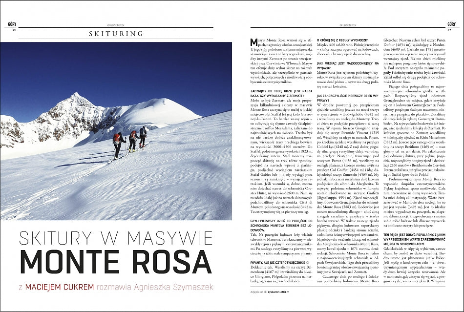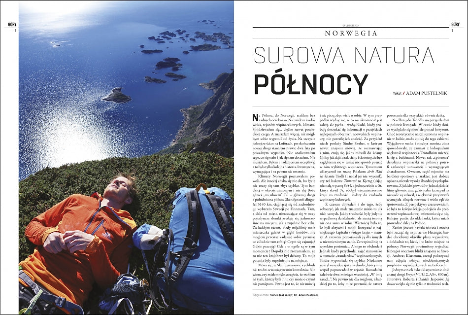 Zima, zima, zima... i choć na razie - przynajmniej w miastach - nie pada śnieg, proponujemy Wam dwa materiały skiturowe: wycieczkę w słynnym masywie Monte Rosa i Doliną Staroleśną. Z chłodem kojarzy się też zwykle Skandynawia. W podróż na Lofoty zaprasza Adam Pustelnik. Przekonacie się, że surowy jest tam nie tylko klimat, ale także reguły wspinaczkowej gry.