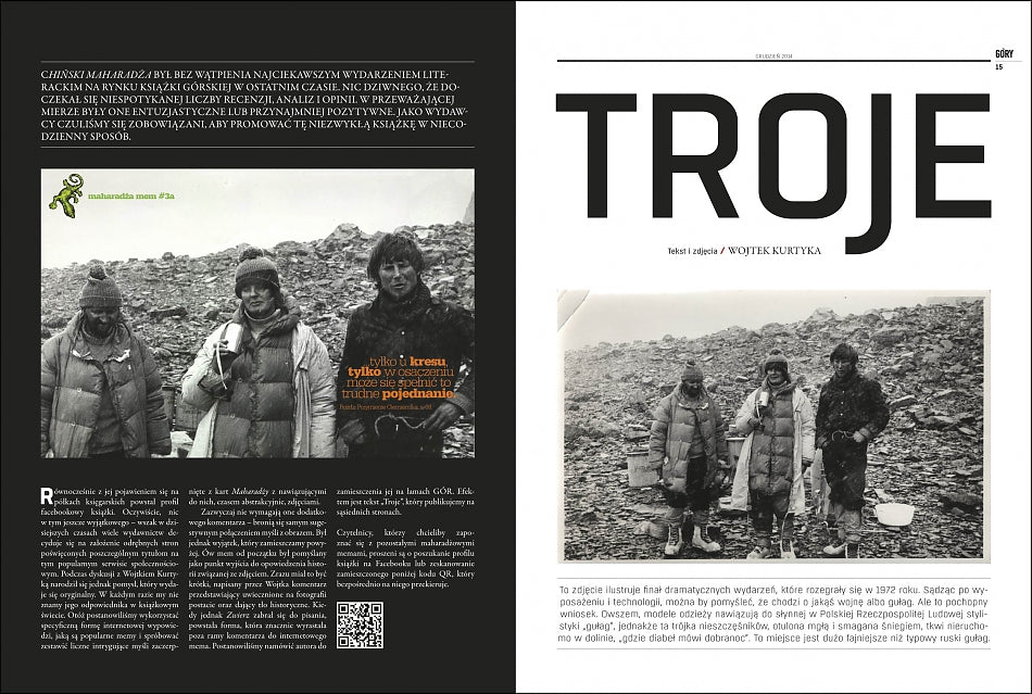 Wreszcie, last ale zdecydowanie nie least. Wydając "Chińskiego maharadżę", nie mieliśmy wątpliwości, że będzie to wydarzenie, które odbije się szerokim echem. Wojtek Kurtyka od lat unikał bowiem nie tylko publicznych wystąpień, ale także publikacji. Tym bardziej miło nam, że w numerze, który właśnie trzymacie w rękach, zamieścił swój tekst, który poprzez internetowy mem łączy się z "Maharadżą". Niejasne to i mętne? Zajrzyjcie na stronę 14.