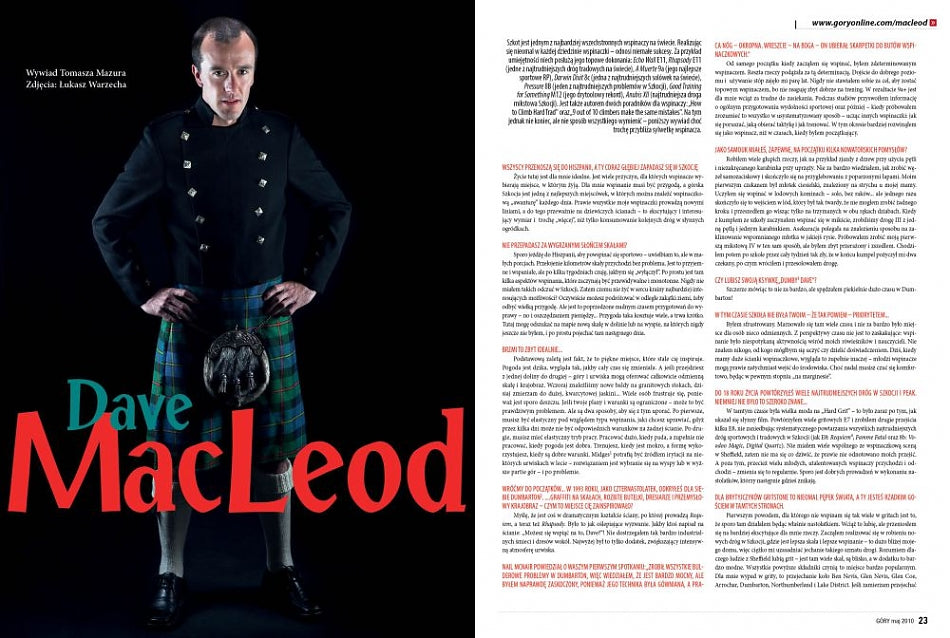 "All-rounder" - tak Anglosasi określają wspinacza, który jest dobry w wielu dyscyplinach. Jak to zwykle w tym języku, brzmi ów idiom dobrze i od razu wiadomo, o co chodzi - nam, Słowianom, pozostaje tylko pozazdrościć. Gdyby w słownikach trzeba było dodać do tego zgrabnego terminu ilustrację, która miałaby oddać jego treść, można by śmiało zamieścić przy nim podobiznę sympatycznego Szkota o słynnym - bynajmniej nie z górskiego, lecz filmowego świata - nazwisku MacLeod. Pamiętam, że pierwszy raz zobaczyłem jego zdjęcie w 2003 roku we włoskim Arco, kiedy w "Tabacco" na rogu rynku przeglądałem europejską prasę wspinaczkową. W zasadzie to oglądałem okładki i zastanawiałem się, co kupić, aby poczytać na campie przy kawce, bo dołączona do półki z czasopismami górskimi kartka, groźnie ostrzegała, że przeglądanie pism przed kupieniem jest zabronione. Niemniej spośród kilku dostępnych numerów wciąż istniejącego wówczas brytyjskiego "On The Edge" postanowiłem wybrać właśnie ten, na którego okładce wspinał się niewątpliwie nieustraszony lokals, ciągnący za sobą dwie żyły liny wpięte w najwyraźniej iluzoryczne punkty przelotowe majaczące poniżej. Mina wspinacza miała świadczyć, że jest właśnie w sytuacji, którą owi elokwentni Anglosasi określają jako "do-or-die situation", a największy napis na okładce nie pozostawiał wątpliwości: "Dave MacLeod - Britain's Best All-Rounder".