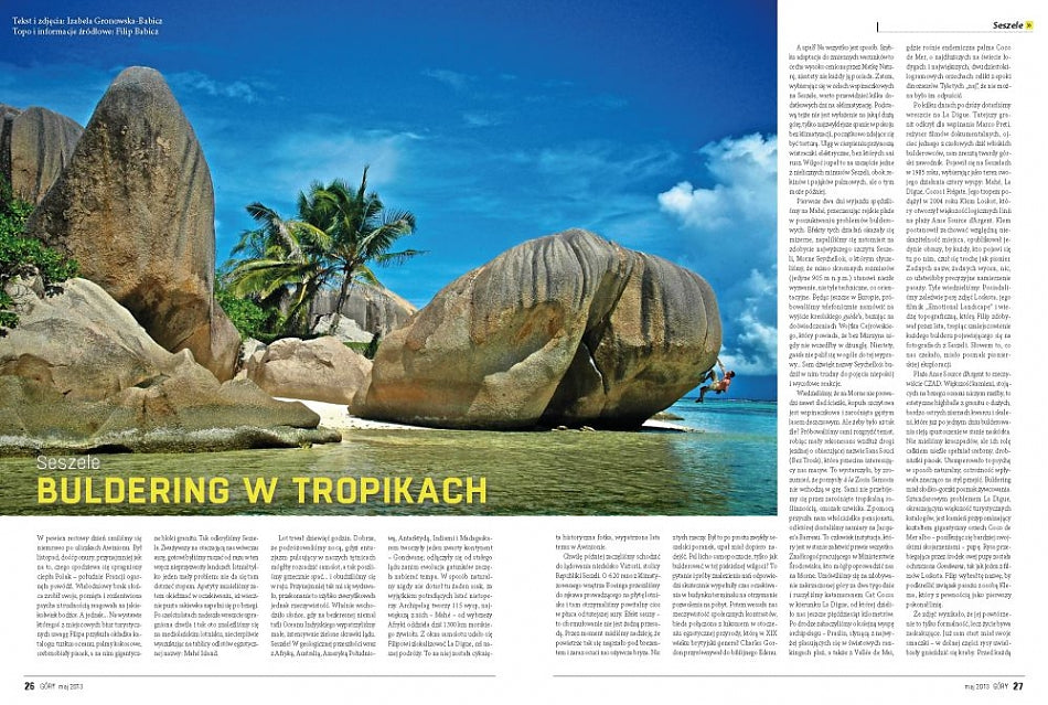 20-stronicowy blok materiałów o egzotycznych miejscówkach bulderowych na pewno będzie świetnym prezentem dla wszystkich miłośników małych form, ale jesteśmy przekonani, że zainteresuje wszystkich, którzy gustują w dalekich podróżach. Pierwszy tekst naszej "bulderowej trylogii" autorstwa Jima Thornburga - doskonałego fotografa, którego czytelnicy GóR kojarzą zapewne z fotoedycji - poświęcony jest kamykom na Wyspach Dziewiczych. Jak zapewnia Jim, jest to "prawdziwy raj bulderowy". Tropikalne wspinanie na porozrzucanych na plażach kamieniach to także propozycja Izabeli Gronowskiej-Babicz, która zabierze was na Seszele. Świetnie napisany tekst z pewnością zainteresuje także tych, którzy za bulderingiem nie przepadają. Za sprawą ostatniego, równie ciekawego tekstu - pióra Bernda Zangerla - przeniesiecie się natomiast do Indii. Także tu, "na krańcu świata", można znaleźć sporo celów bulderowych. Warto nadmienić, że cała bulderowa trylogia jest ilustrowana znakomitymi zdjęciami. Na koniec, z niekrytą satysfakcją, chcielibyśmy poinformować, że wszystkie te teksty - także zagranicznych autorów: Zangerla i Thornburga - zostały napisane specjalnie dla nas, a więc dla Was, Drodzy Czytelnicy GóR :-).