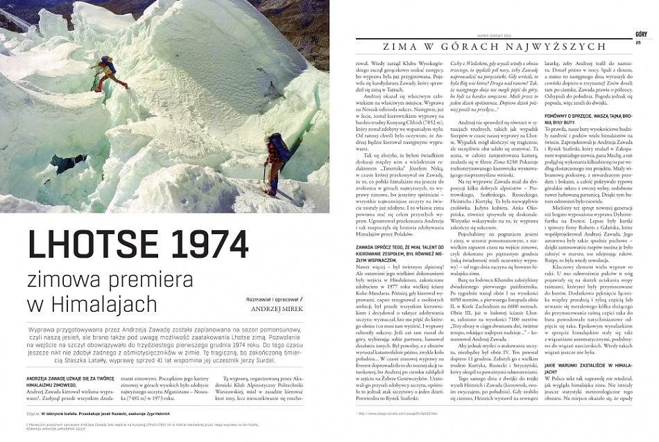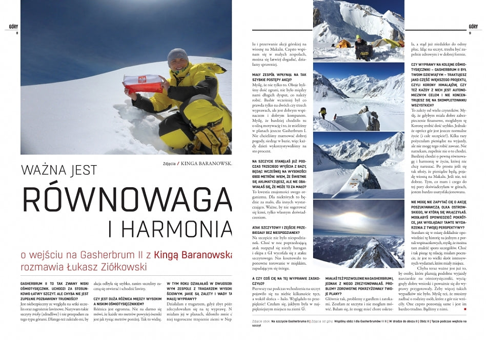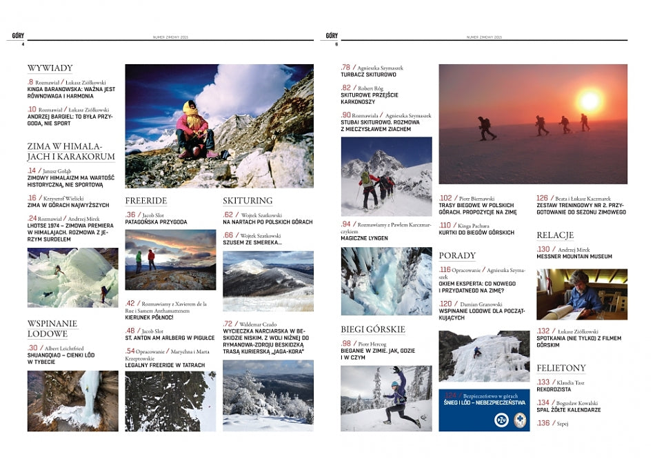 Nie koncentrujemy się jednak wyłącznie na narciarstwie. Z Kingą Baranowską rozmawiamy o wejściu na Gasherbrum II, a z Andrzejem Bargielem o zjeździe z Broad Peak. W zimowe klimaty gór najwyższych przenoszą nas Krzysztof Wielicki i Jerzy Surdel, a w podróż do Tybetu w poszukiwaniu idealnych lodospadów zabiera Albert Leichtfried.