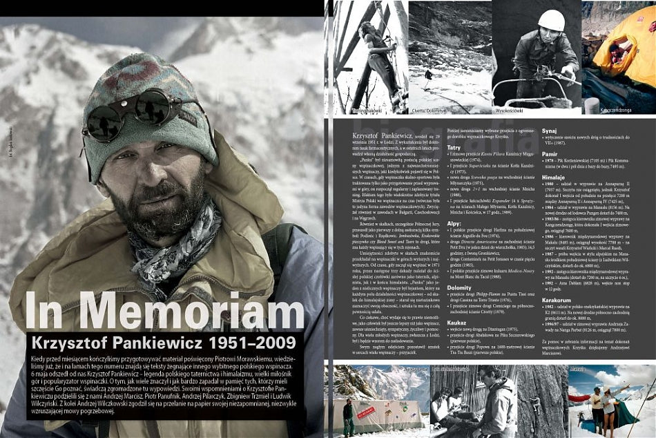 Końcowe wersy artykułu Moro traktujące o Piotrku Morawskim i innych nieżyjących już przyjaciołach są niejako symboliczną zapowiedzią nastroju, w jaki wprowadza specjalnie przez nas "odkolorowane", znakomite zdjęcie portretowe przedstawiające Krzysztofa Pankiewicza, który zginął tragicznie w maju tego roku. Z naszych nielicznych kontaktów redakcyjnych z Krzyśkiem wynikało, że jak ulał pasowało do niego powiedzenie - "dusza nie człowiek". O tym, że tak właśnie było, świadczą również zgromadzone w tym materiale, niezwykle ciepłe wypowiedzi jego przyjaciół i partnerów wspinaczkowych oraz skala odzewu na pomysł pożegnalnego materiału w GóRACH. Kiedy usłyszałem od Maćka Ciesielskiego o wyjątkowej mowie wygłoszonej w czasie pogrzebu przez Andrzeja Wilczkowskiego, pojawił się pomysł, aby poprosić mówcę o jej wykorzystanie na naszych łamach. Pan Andrzej zgodził się utrwalić byt, który w przeciwnym razie pozostałby zapewne jedynie głęboko w pamięci uczestników ceremonii, i w ten sposób powstała koda artykułu pożegnalnego, której nie waham się nazwać najbardziej wzruszającym tekstem, jaki kiedykolwiek ukazał się na naszych łamach.