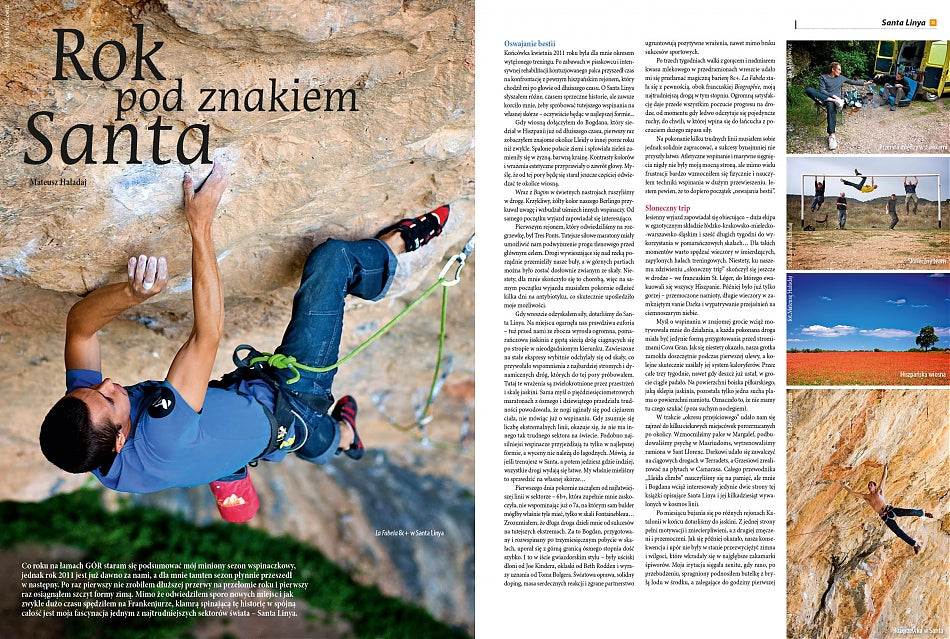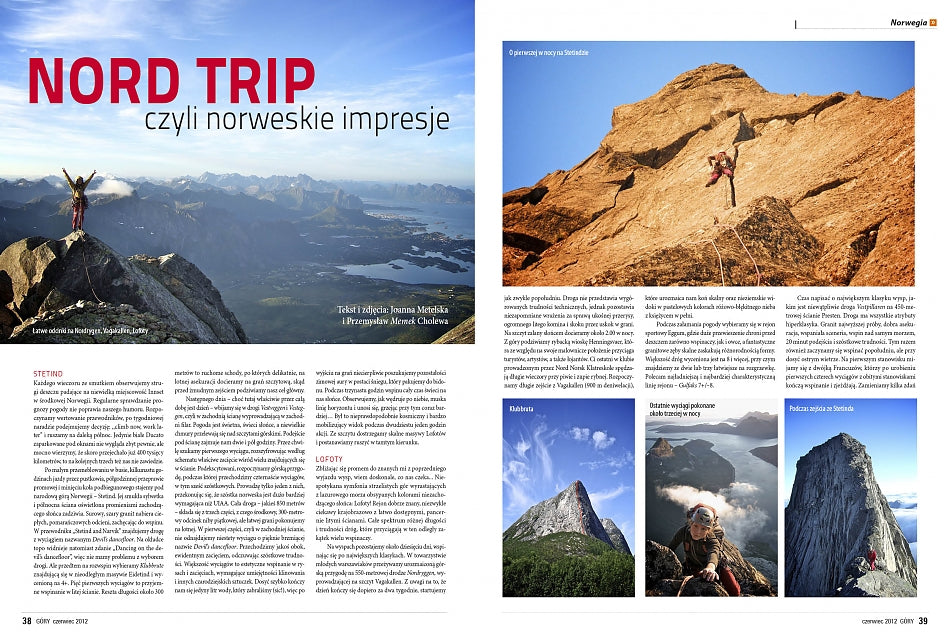 Norweskie klimaty znajdziecie także we wspomnieniach z Arch Wall i wspinaczkowej podróży po tym kraju. W numerze zamieściliśmy ponadto rozmowę z Markiem Raganowiczem i Marcinem Tomaszewskim, którzy wytyczyli nową, trudną bigwallową drogę na Ziemi Baffina, wywiady ze specjalistami od piachów: Markiem Płonką i Sebastianem Czechowskim, podsumowanie tatrzańskiego sezonu zimowego 2011/12, wspomnienia Mateusza Haładaja z Santa Linya. Nie mogło też zabraknąć stałych działów naszego magazynu: Kąciku Tatromaniaka, Vademecum Dietetyka i Slackline Corner.
