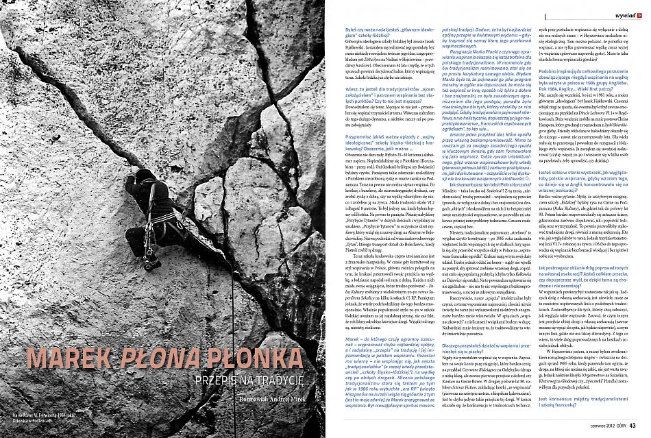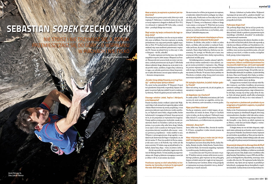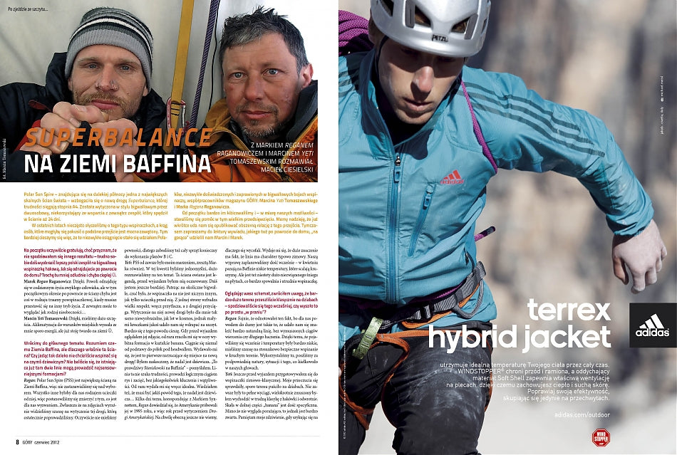 Czerwcowy numer zaczynamy od mocnego uderzenia, czyli wywiadu z Markiem Reganem Raganowiczem i Marcinem Yetim Tomaszewskim, którzy wytyczyli poważną big-wallową drogę Superbalance (VII, A4, M7+) na Polar Sun Spire - największej ścianie na Ziemi Baffina. Chłopaki spędzili w ścianie aż dwadzieścia pięć dni, a szczegóły tej wspinaczki robią spore wrażenie.