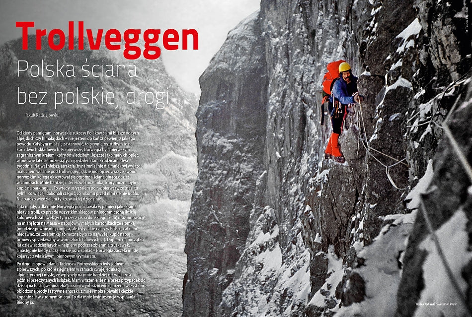 Nieco oldschoolowa okładka przedstawiająca Tadeusza Piotrowskiego na Direttissimie Trollveggen - która spotkała się z bardzo entuzjastycznym przyjęciem na naszym facebookowym profilu - zwiastuje obszerny cover story autorstwa Kuby Radziejowskiego. Trzonem materiału jest historyczne opracowanie opisujące wspinaczkową eksplorację Trollveggen ze szczególnym uwzględnieniem polskiej działalności w tym masywie. Jak pisze autor, "zimowe przejścia lat siedemdziesiątych [w Norwegii - przyp. red.] to największe sukcesy alpinistyczne w naszej historii. W jakiś sposób wykraczające poza wszystko, co Polacy zrobili wcześniej w Europie i jeśli chodzi o ich znaczenie i przełomowość - według mnie stoją w jednym szeregu z największymi polskimi osiągnięciami w górach wysokich i najwyższych". Dodatkowym atutem materiału jest wykaz polskich przejść w dolinie Romsdal i okolicach, a także toposy Troll Wall i okolic.