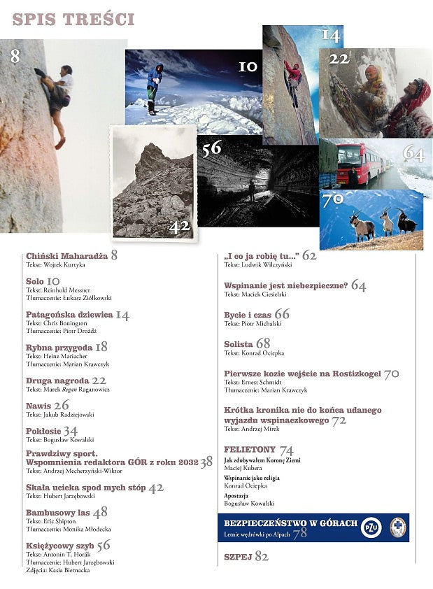 Autorami są m.in. Chris Bonington, Wojtek Kurtyka, Reinhold Messner, Heinz Mariacher, Eric Shipton, Jakub Radziejowski, Marek Raganowicz, Maciek Ciesielski, Bogusław Kowalski, Andrzej Mecherzyński-Wiktor czy Konrad Ociepka.