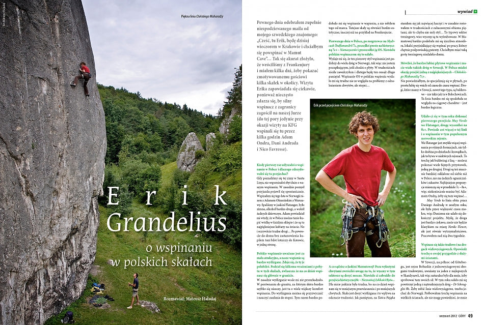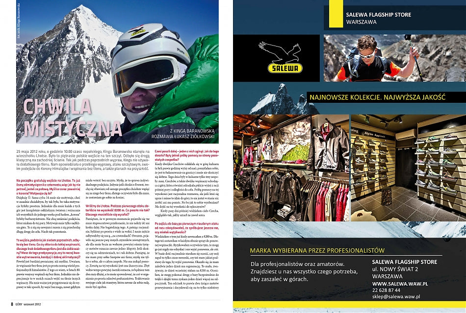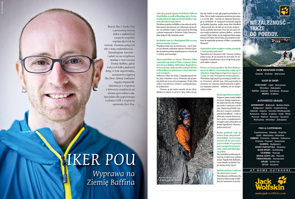 Numer otwierają dwa wywiady: z Ikerem Pou i Kingą Baranowską. Iker opowiada o modnej w tym sezonie Ziemi Baffina i przejściu drogi The Door, natomiast Kinga o swoim wejściu na Lhotse. Wątek gór najwyższych kontynuuje Adam Bielecki. Niedawny zdobywca K2 postanowił specjalnie dla GóR zredagować fragmenty swojego dziennika z wyprawy.