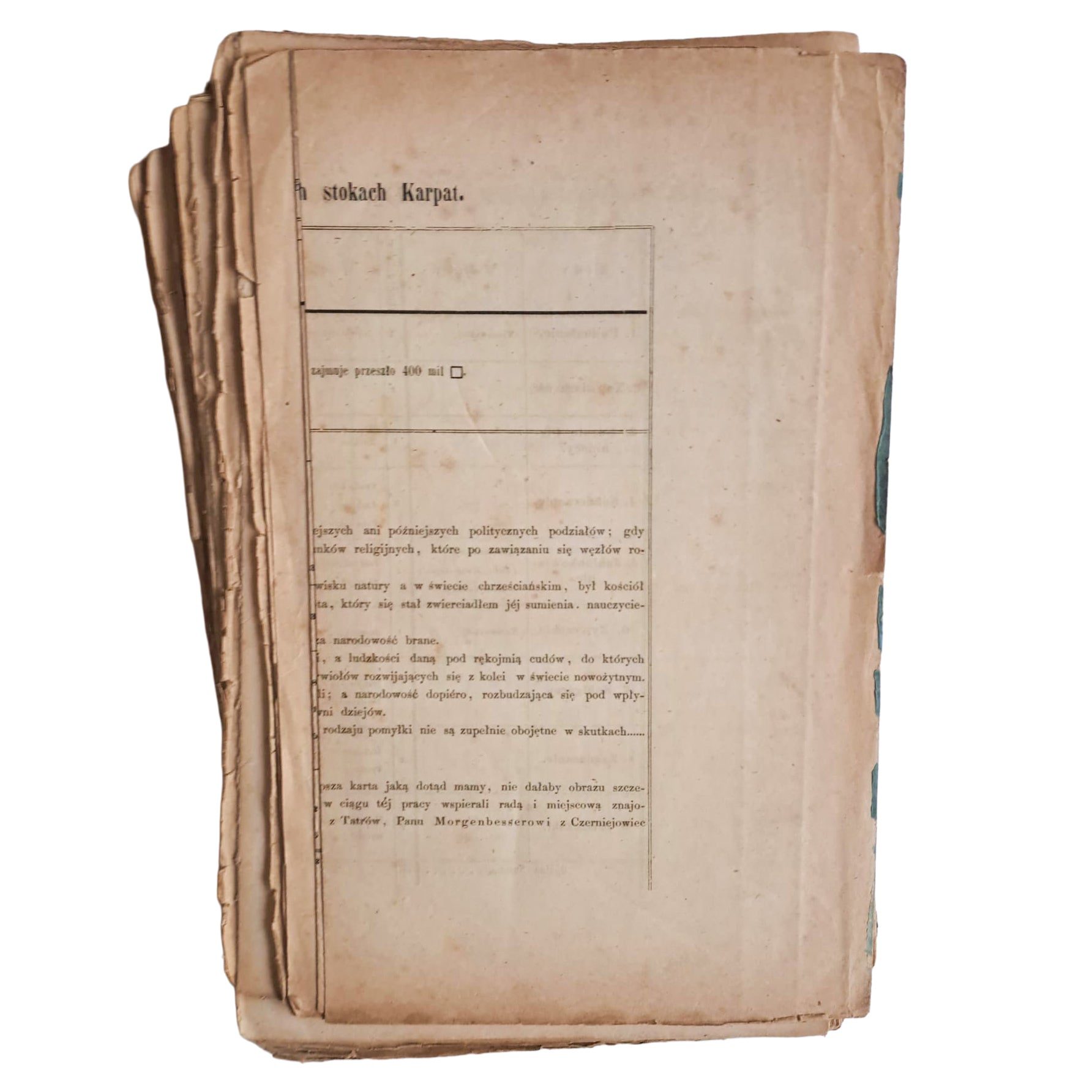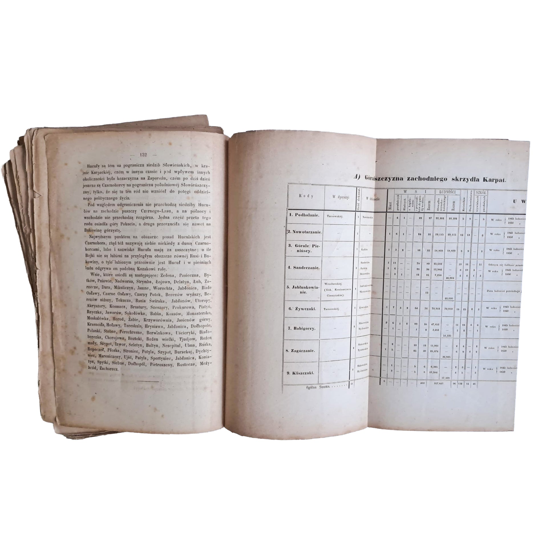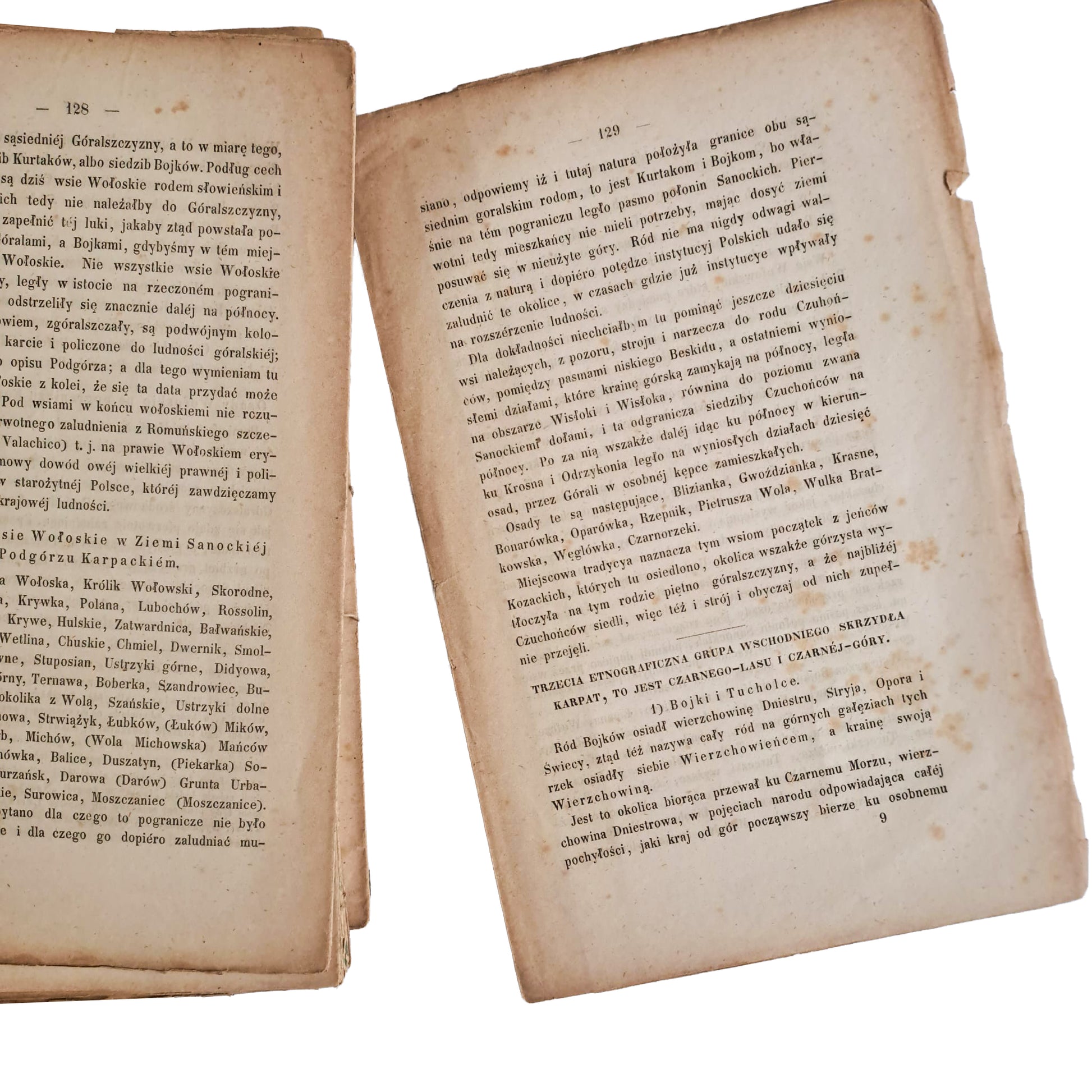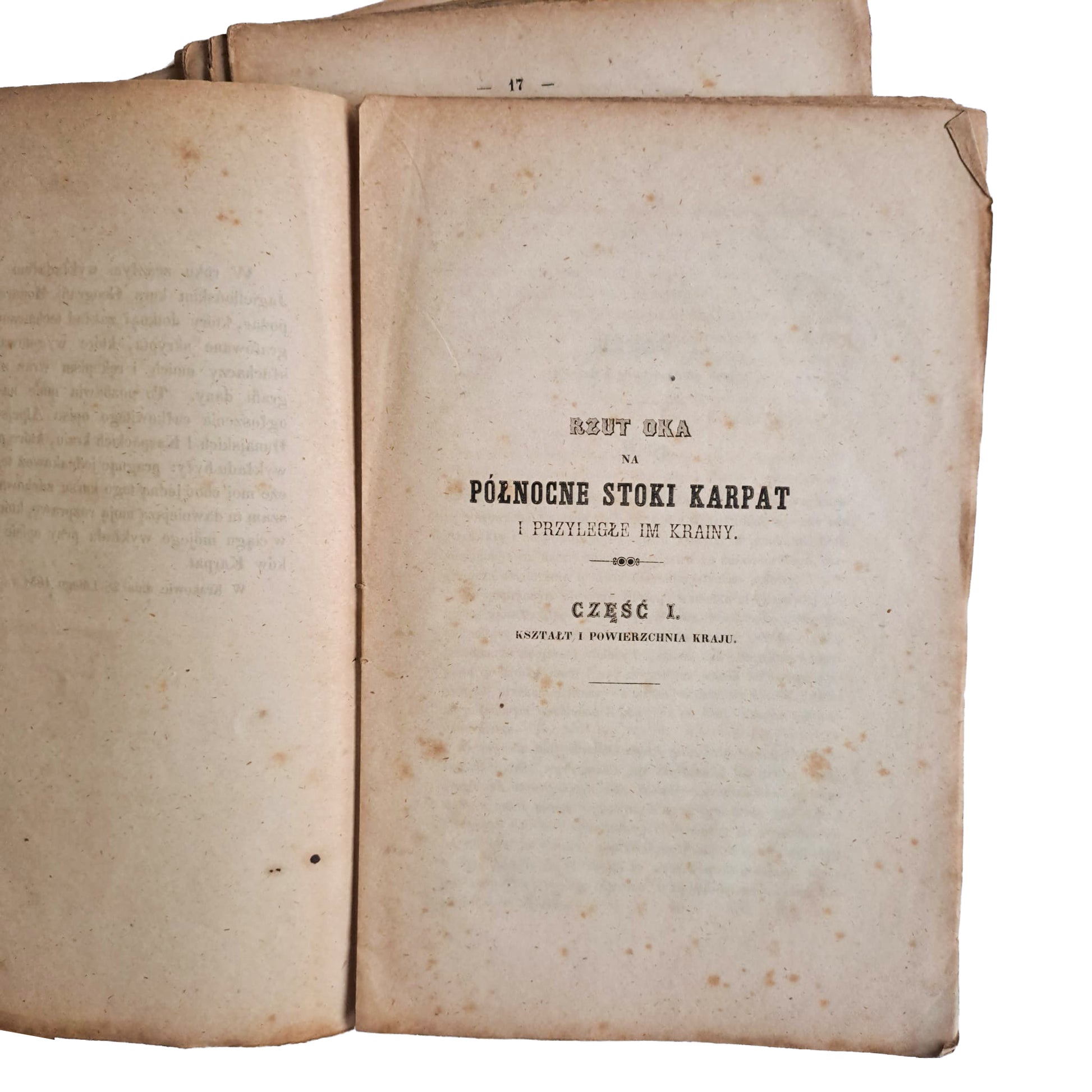 Sztandarowe dzieło geograficzno-etnograficzne Wincentego Pola (1807-1872), powstałe w połowie XIX wieku, wydanie z 1851 roku. Opisany w nim - pod względem topograficznym, hydrograficznym, a wreszcie kulturowym - teren rozciąga się na północ od głównego grzbietu Karpat od Bramy Morawskiej, przez Tatry, Bieszczady i Huculszczyznę, po Bukowinę. Drobiazgowe rozważania naukowca, jednego z pierwszych badaczy Karpat, urozmaicają malownicze opisy pobudzające wyobraźnię, skreślone ręką literata i poety.