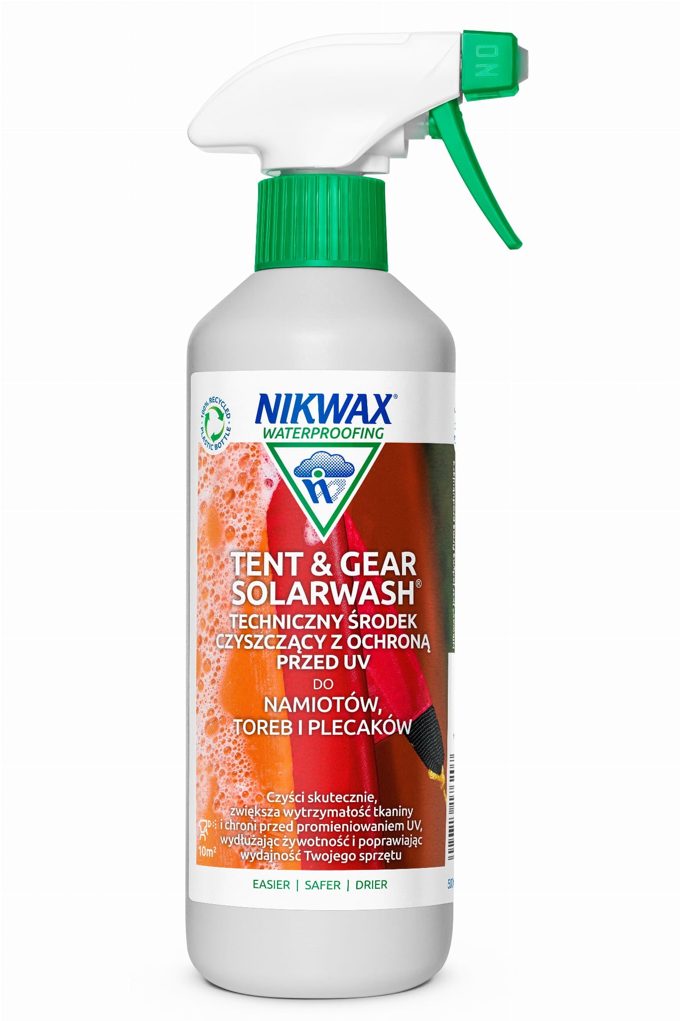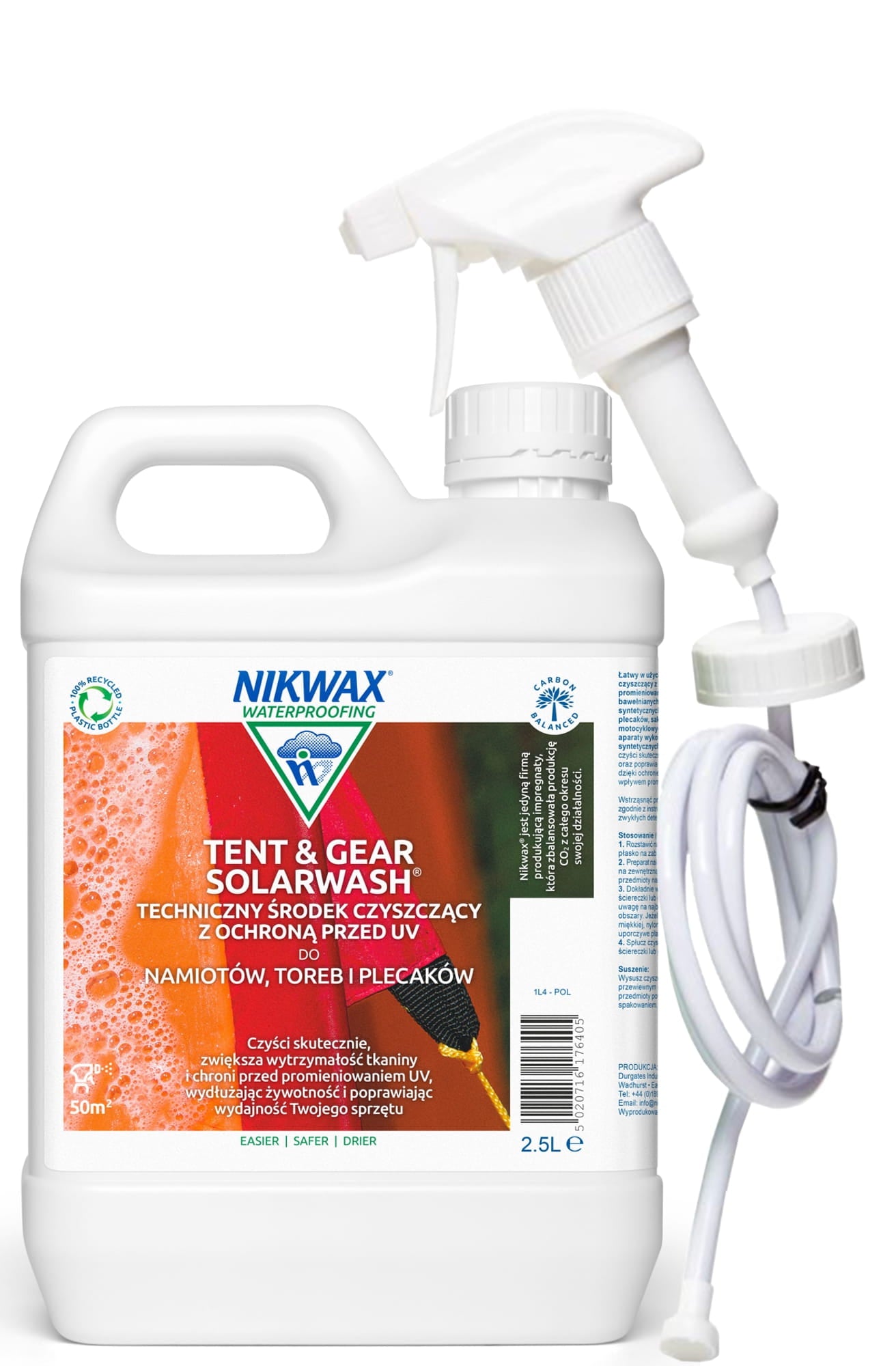 Płyn w atomizerze do czyszczenia namiotów i sprzętu z ochroną UV Nikwax Tent & Gear SolarWash można stosować na materiałach o właściwościach wodoodpornych w tym namiotów, markiz, plecaków i futerałów na aparaty. Nadaje się do czyszczenia wszystkich materiałów wodoodpornych, dzięki niemu namioty i sprzęt turystyczny dłużej zachowają swoje właściwości. Preparat można nakładać na nowe lub używane namioty oraz sprzęt. Odnawia właściwości wodoodporne tkanin i zapewnia ochronę przed promieniowaniem UV. Wygodna forma butelki z atomizerem ułatwia aplikację płynu. Dla lepszego efektu i ochrony zaleca się po wyczyszczeniu zastosowanie impregnatu do namiotów i sprzętu z ochroną UV Nikwax Tent & Gear SolarProof.